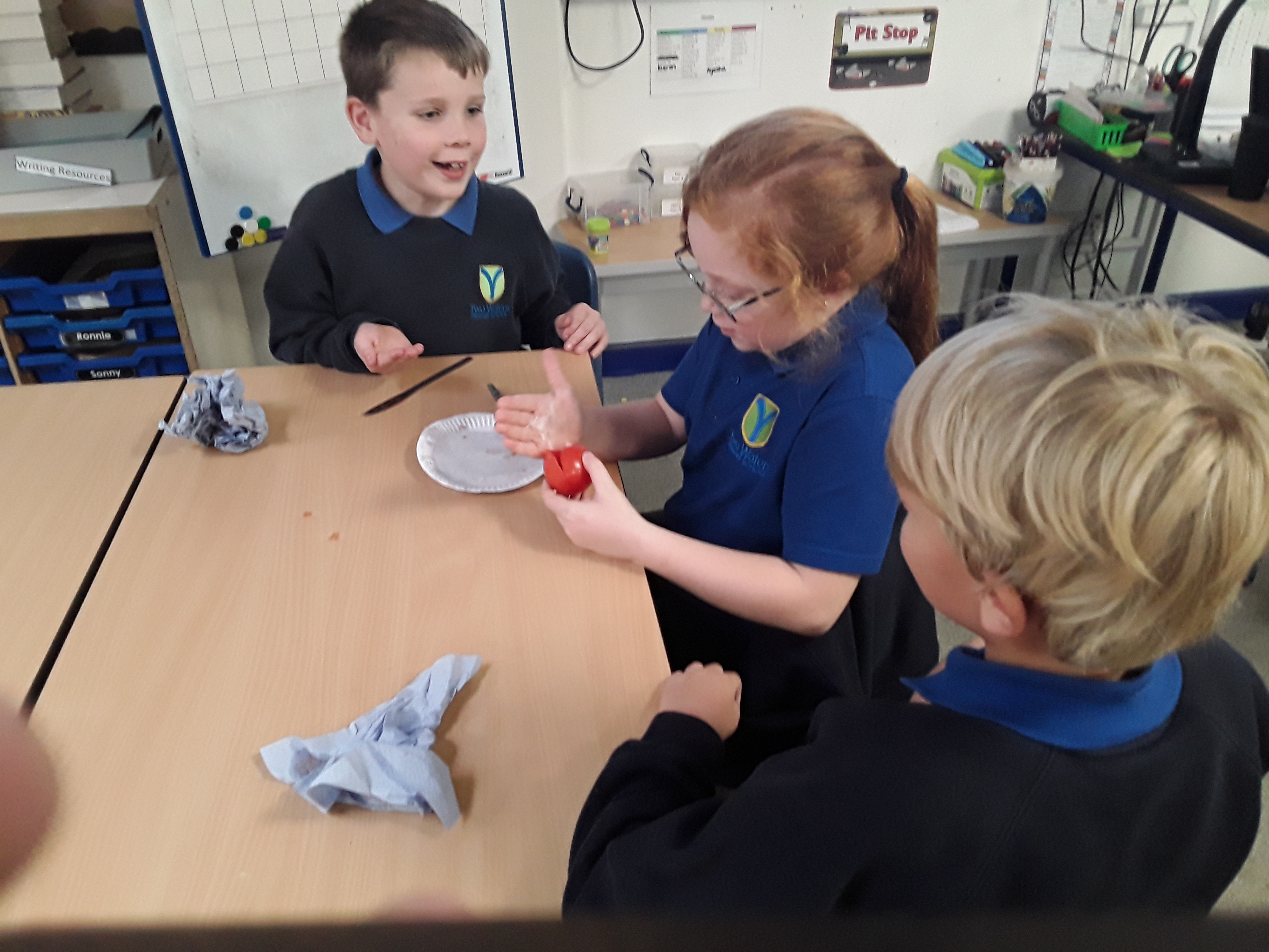 In groups, we began the process of mummifying a tomato. Firstly, we cut open the tomato (body) and scooped out the seeds (organs!). Afterward, we rinsed the tomato, rubbed salt all over it (Natron) and then wrapped it in our version of linen!