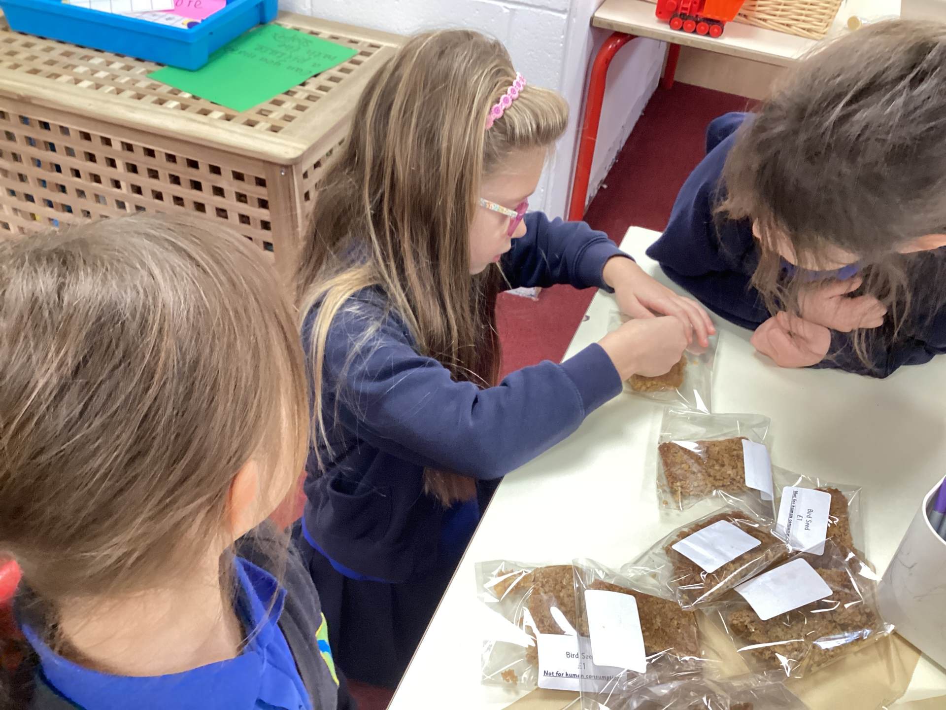 On Thursday, we carefully packaged and labelled all the flapjacks, ready for selling on Friday. Then came the big moment… Had the children saved enough money for the movie? Yes, they had! Since they resisted spending their pot earlier in the week, we enjoyed a lovely class movie with popcorn and juice before lunch.