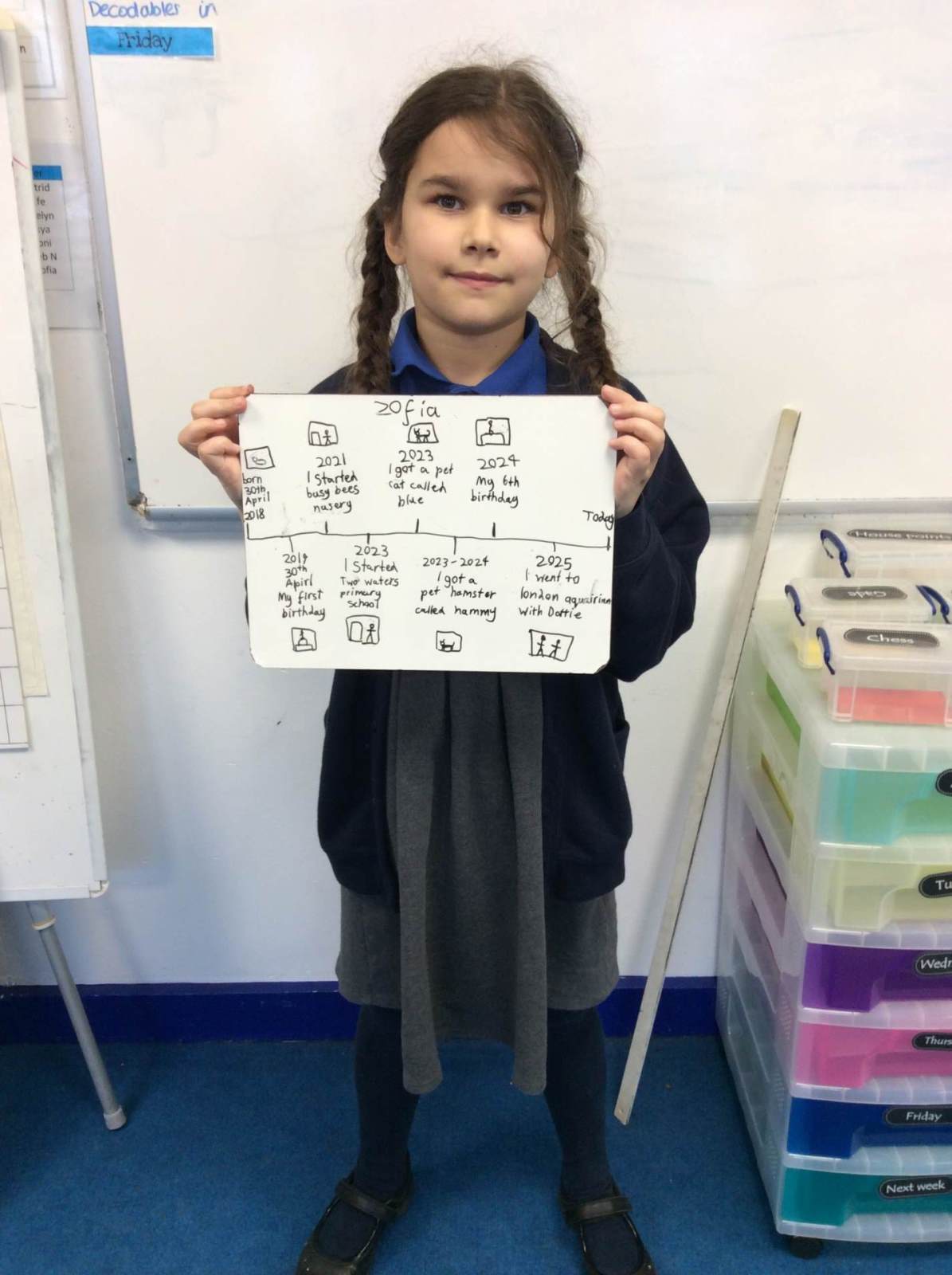 In our history lesson this week, we learned about what history is and how we find out about events and people from the past. We explored the idea that history helps us understand how things have changed over time and why the world is the way it is today. Our key word for the lesson was chronology, which means the order in which events happen. To help us understand this better, we each created our own timelines showing the most important moments in our lives so far. This helped us see how our personal histories can be organised in time, just like the events we study from the past.