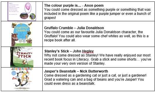 As World Book Day is fast approaching, please see some outfit inspiration for the big day, based on the books and characters we have looked at in Literacy so far.
